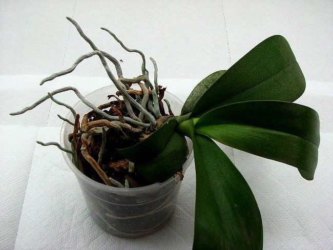 Вот это и есть настоящая причина для беспокойства. Действовать нужно немедленно, пока окончательно не загубили растение. Для этого розетку растения вместе с корнями необходимо извлечь из горшка, тщательно промыть корни, продезинфицировать, промокнуть от лишней влаги и аккуратно удалить сгнившие отростки корней. После всех проделанных процедур растение надо высадить в новый прозрачный цветочный горшок, наполненный свежей подготовленной для высадки орхидей корой.