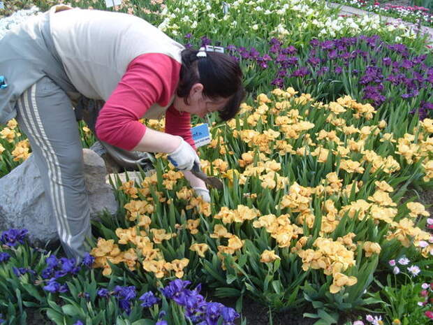 Уход за ирисами несложный, но выполняют его садоводы по-разному. Например, существует распространённое мнение, что увядшие цветоносы у ирисов нужно не срезать, а выламывать вручную. Объясняется это тем, что при выламывании будет меньше шансов случайно перенести патогенные бактерии или споры грибка от больного растения к здоровому — такая ситуация иногда происходит при обрезке секатором.