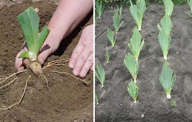 Для этого выбирают однолетние корневища, похожие на луковицы или продолговатые делёнки. При пересадке ирисы не нужно заглублять, так как корешки любят греться на солнце. Обычно делают холмик из песка на дне посадочной лунки и раскладывают аккуратно в ней делёнку.