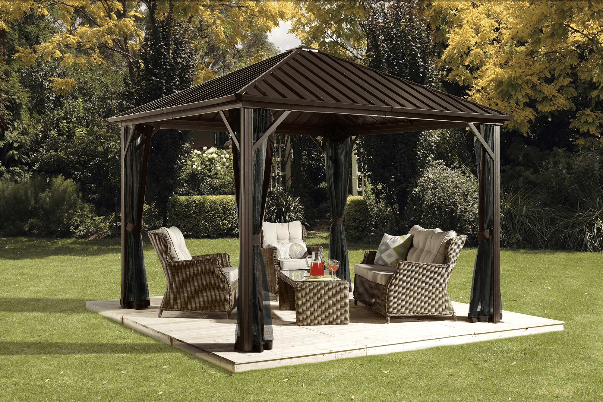 Прекрасная алюминиевая беседка с брезентовым навесом. Беседка расположена над кирпичным двориком и обставлена плетеными стульями насыщенного шоколадно-коричневого цвета.