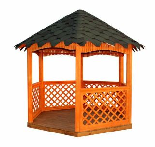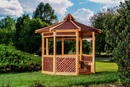 Решетка, бревенчатые стенки и шестиугольная черепица придают этой уникальной деревянной беседке экзотический вид.