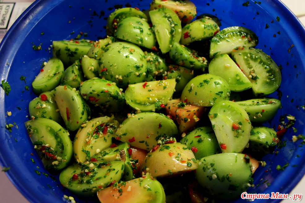 Способ приготовления салата из зеленых помидоров :