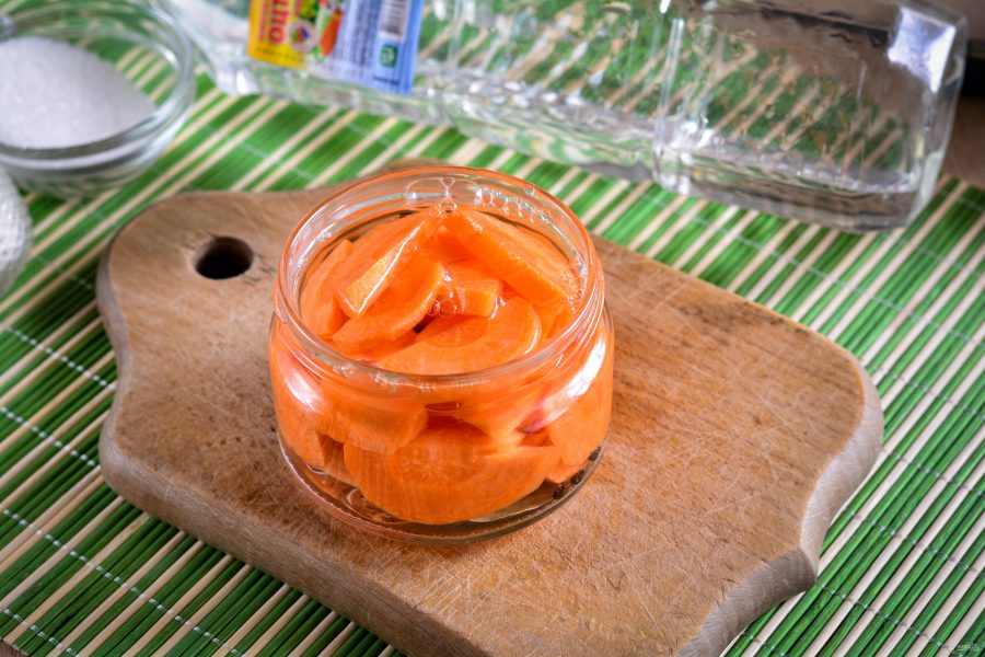 Морковь помыть, очистить от кожуры и сразу же опустить в крутой кипяток. Дать немного там остыть и нарезать на небольшие кружочки. Подготовить тару из стекла и поместить туда морковь.