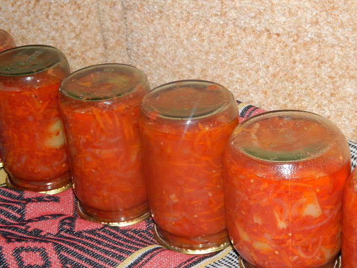 Также сперва парадоксальным было использование готового соуса в закатке, но потом поняла, что этот шаг оправдан. Салат получается сладковатый на вкус, с обильным вкусным соусом. Из указанных продуктов получается 4 литровых банки салата и ещё около 700 мл остаётся, но там больше соуса, чем салата. Поэтому уже не закатываю, а оставляю как добавку-соус к кашам. По желанию можно добавить жгучий перчик.