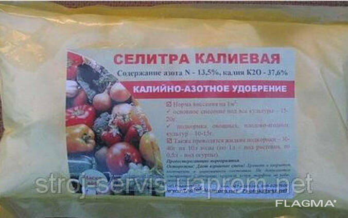 - Калиевая селитра. Содержит калий (45%) и азот (15%). Применяется в закрытом грунте в жидком и сухом виде. Раствор готовят с учетом назначения, разбавляя в ведре воды определенное количество селитры: 15 г — для цветов, 20 г — для ягодных кустарников и овощей, 25 г — для плодовых деревьев.