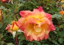 На фото: Сорт розы ‘Amber Queen’Лампион – обильно цветущий новый сорт немецкой селекции с ароматом средней интенсивности. Цветки биколор – желтые с красными наружными лепестками. Куст высотой до 90 см.