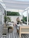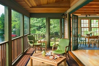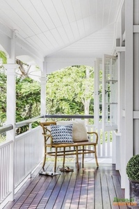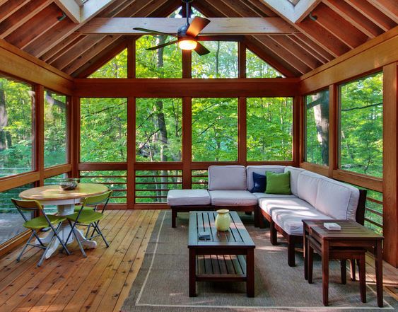 В идеале это пространство должно рассматриваться как открытая комната с удобным диваном, прочным столом, пуфами, подвесными светильниками и растениями. Поскольку веранда обычно подвергается резкому солнечному свету и дождю среди других погодных условий, они обычно строятся из винила, композитного дерева, каменной плитки и обработанных материалов.