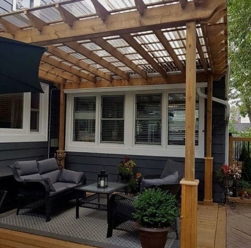 Веранда в стиле пергола Пергола — универсальность заключается в том, что ее не нужно прикреплять к вашему дому, а с прямоугольной крышей стиль перголы может привнести легкость и воздушность, создавая тень и эстетическую привлекательность для вашего открытого пространства.