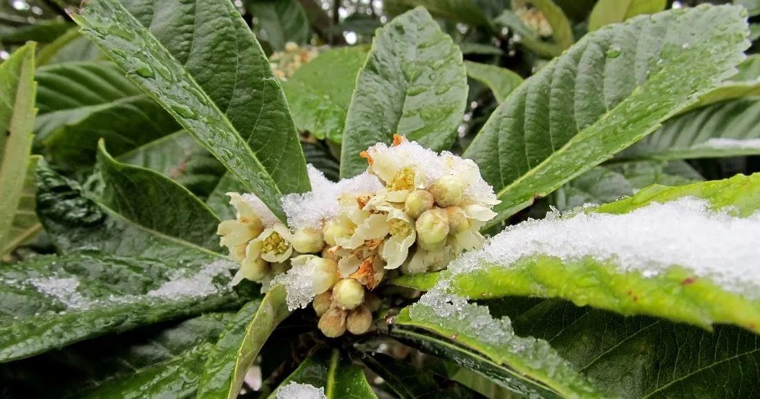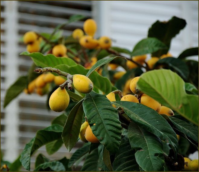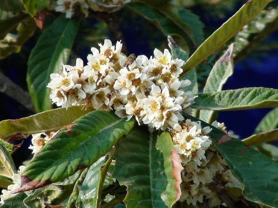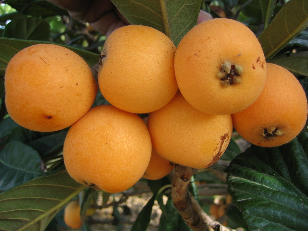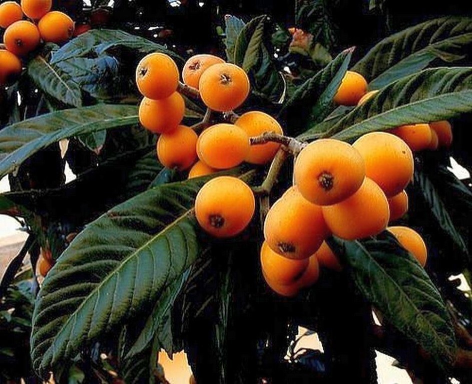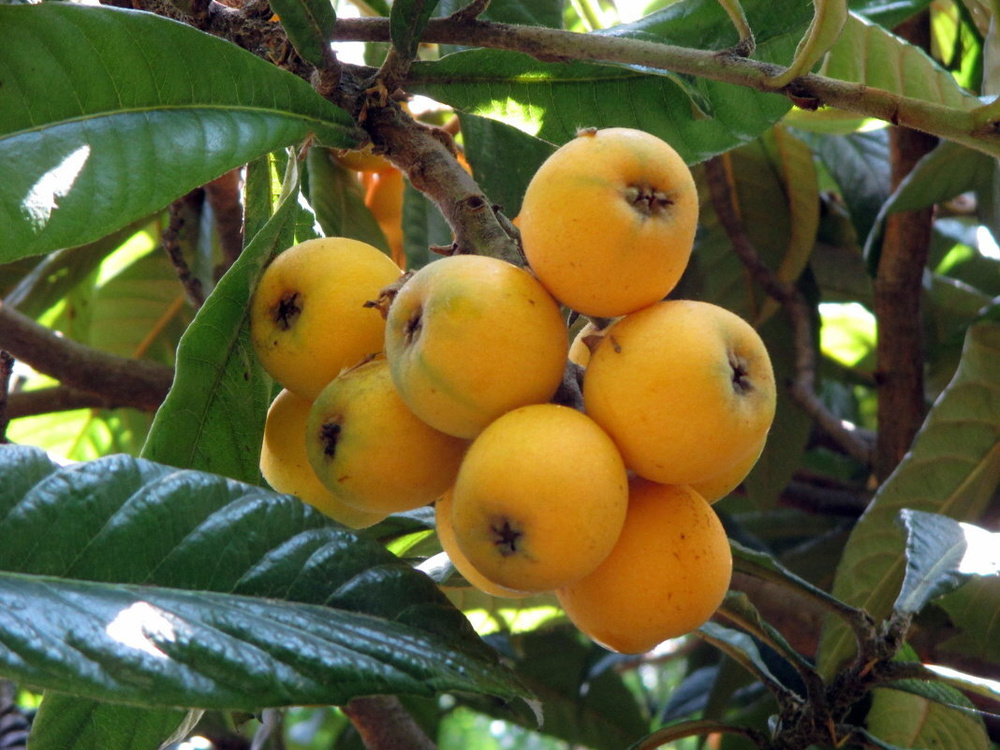 Мушмула японская. Растение в виде раскидистого дерева до 8 м в высоту имеет довольно тонкие ветки, покрытые темной корой. Овальная листва длиной до 25 см и шириной 7-8 см имеет опушенную кожистую поверхность. Листочки растут на маленьких черешках. Метельчатые соцветия распускаются в сентябре-октябре на концах побегов.