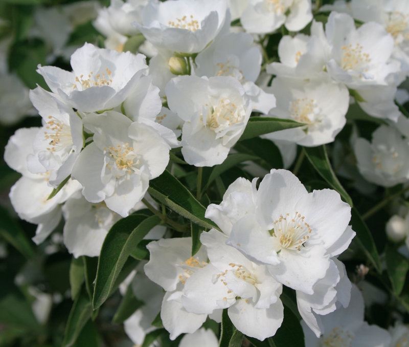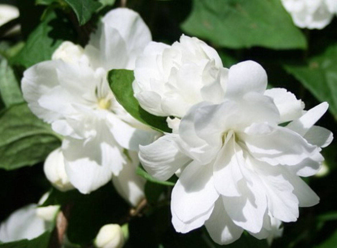 Philadelphus x virginalis ‘Dwarf Snowflake’ — компактный сорт высотой всего 3-4 фута с махровыми белоснежными цветками с контрастирующими темно-зелеными листьями.