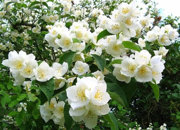 Это гибрид, включающий несколько десятков подвидов. Их объединяет насыщенный сладкий запах. Кусты разрастаются в густые трехметровые заросли. Мелкие и яркие листья разбавлены ароматными цветами. Из самых известных видов – морозостойкий махровый чубушник, густой и компактный Монблан, пушистый колокольчик Сноубель, гибкий и раскидистый Вирджинал, пушистый декоративный Биколор и роскошная Горностаевая мантия.