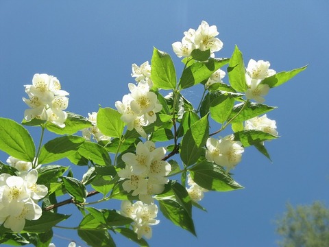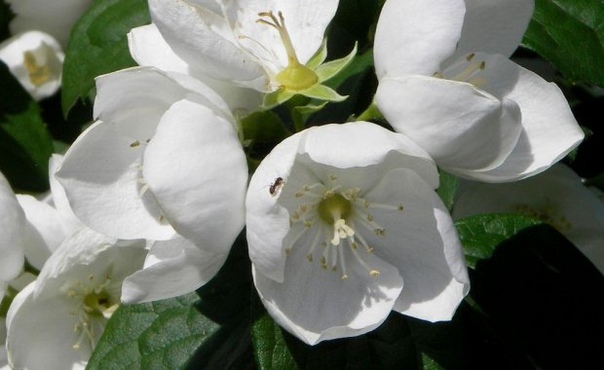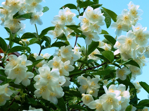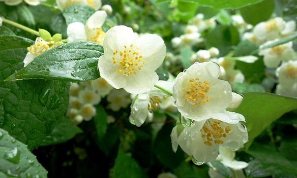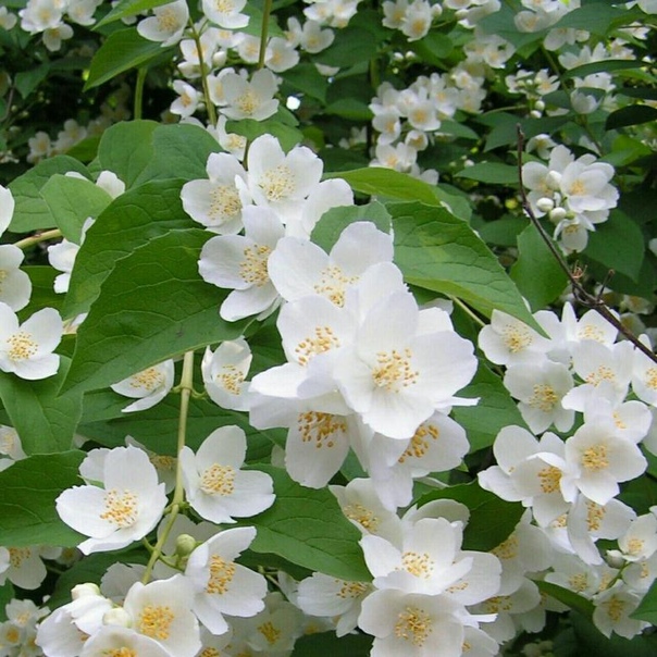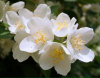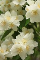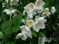 Чубушник обыкновенный. Кустарник с прямостоячими разветвленными отростками вырастает до 3 м в высоту. Он покрыт простыми овальными листьями до 8 см в длину. Рыхлые кисти на краях побегов состоят из простых бело-кремовых цветов до 3 см в диаметре.