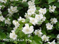 - Мажори – раскидистый кустарник высотой до 1,5 м с дугообразными побегами покрыт тёмно-зелёной листвой, а в конце июня обильно покрывается махровыми, очень ароматными цветами;