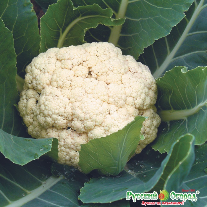 Голландский гибрид идеально подходит для выращивания в любом регионе РФ. Цветная капуста образует круглую приплюснутую головку. Она плотная и прикрыта листьями. Иногда ее вес достигает 3 кг.