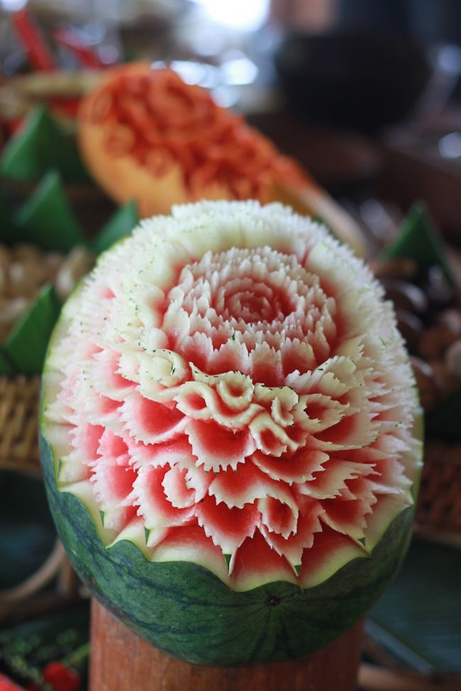 Это красивая цветочная скульптура, созданная талантливым Такаши Ито, знаменитым резчиком по фруктам, у которого есть даже собственный веб-сайт , так что вы можете пролистать его увлекательные творения.