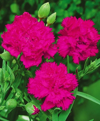 - «Аврора» (Aurora). Кустарники среднего размера имеют высокие декоративные качества. На длинных прямостоячих побегах располагаются розовые бутоны, собранные в соцветия. Густые махровые лепестки раскрываются в начале лета и продолжают цвести до конца октября. Холодостойкий сорт подходит для умеренного климата, а в южных регионах может украшать клумбы яркими бутонами дважды за сезон. Декоративные цветки хорошо переносят соседство с другими видами гвоздичных.