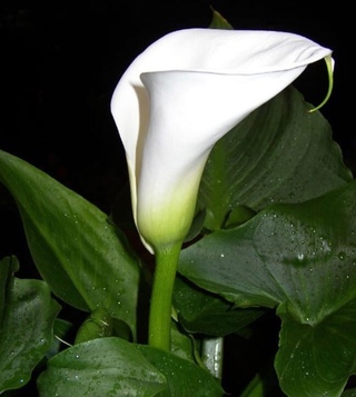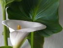 Калла «Nicolai». Отличается большим ростом – длина цветоноса достигает 1,5 м. Листки стреловидной формы имеют темно-зеленый цвет. Покрывало бело-зеленоватого окраса. Его диаметр варьируется в пределах 8 – 12 см.