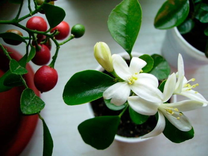 Экзотическая. Декоративную ценность этого растения составляют не только цветы, но и листья. Их отличает насыщенный изумрудный оттенок. Сама листва обладает уникальным ароматом, напоминающим руту. Бутоны крупные, белые, самоопыляемые, развиваются от двух до трех недель. На их месте со временем вырастают съедобные плоды красного цвета.