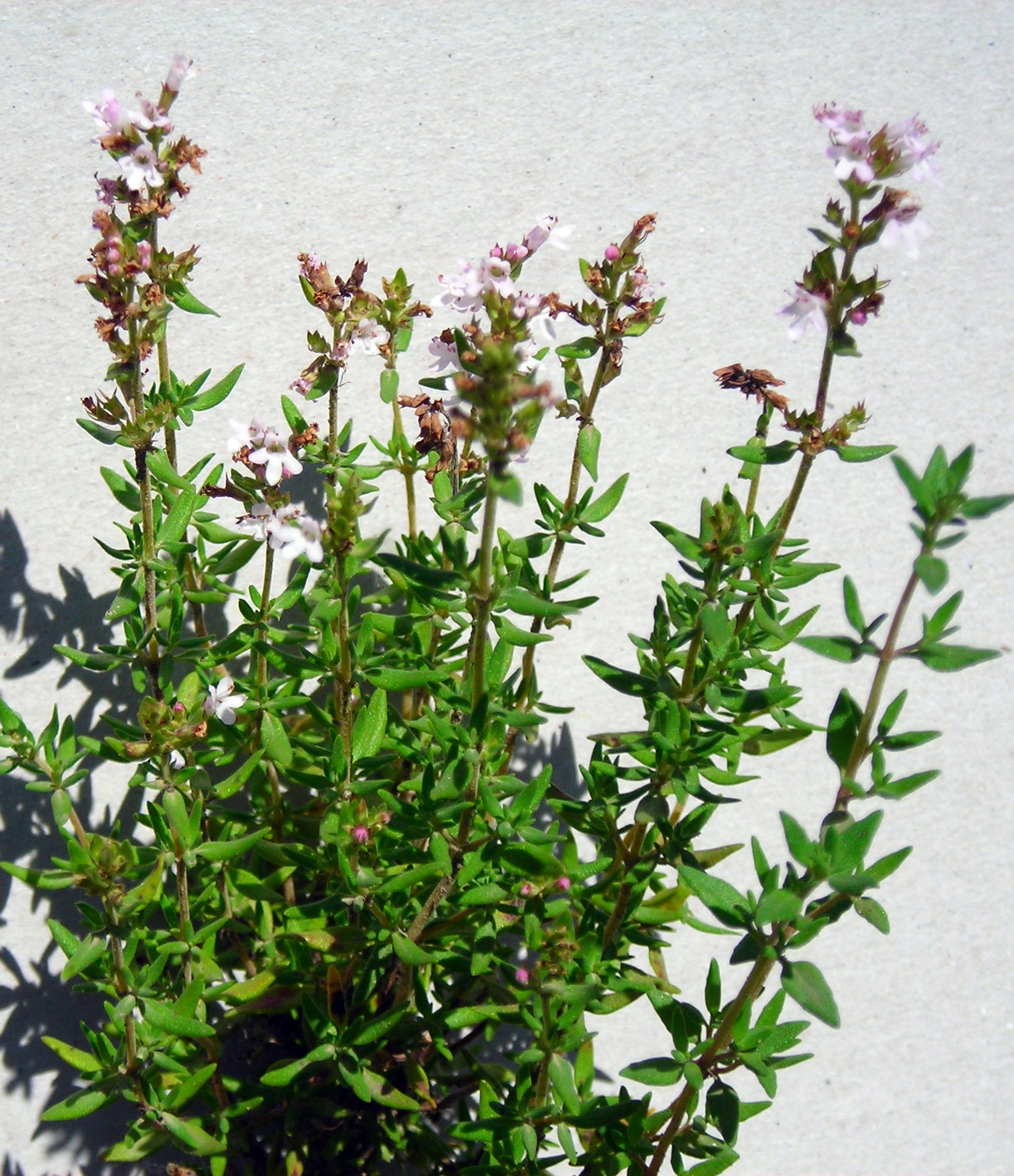 Тимьян, Thymus vulgaris , представляет собой небольшой многолетний вечнозеленый кустарник семейства Lamiaceae, выращиваемый в основном из-за его листьев, которые используются в качестве травы.У тимьяна прямостоячий или восходящий характер роста и множество древесных ветвящихся стеблей. Листья тимьяна линейные или эллиптические и расположены на стеблях попеременно. Листья густо покрыты мелкими волосками и имеют на поверхности многочисленные красно-коричневые сальные железы, которые выглядят как маленькие точки.