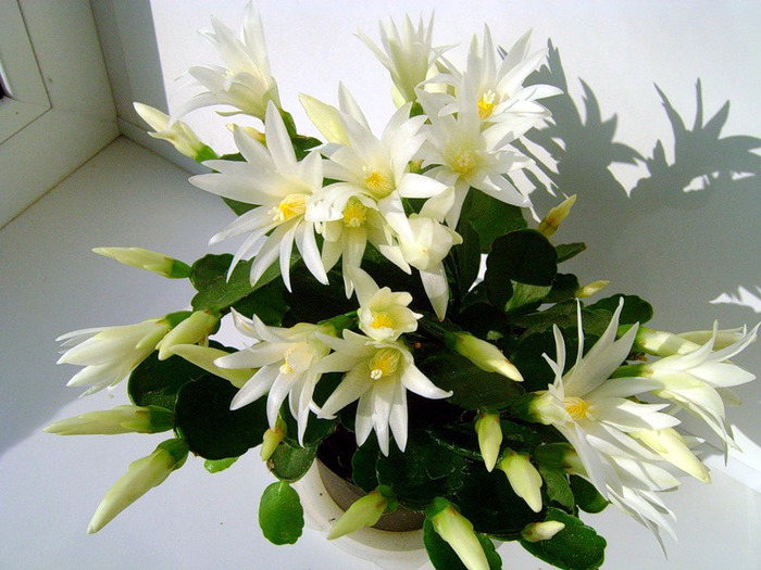 Шлюмбергера усеченная (Schlumbergera truncatus). У этого вида, в отличии от шлюмбергеры Рассела, сегменты побегов с острыми зубцами. Цветки часто ассиметричные, скошенные с одного бока, обычно выше уровня побегов, разной окраски – все оттенки красного, оранжевого, белые.