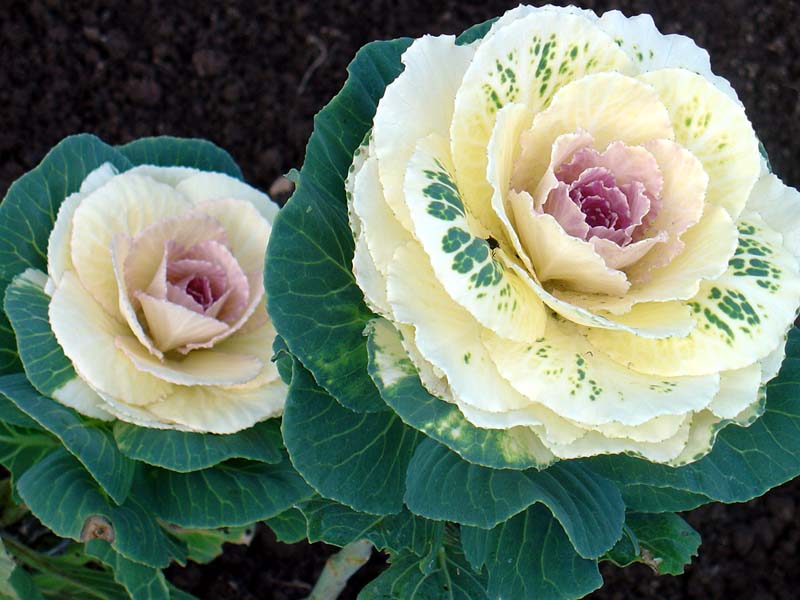 Иногда розетки бывают плоские, иногда приподнятые, образующие настоящие кочаны. В ширину одни из них могут достигать одного метра, другие же образуют достаточно компактные розетки, сравнимые с величиной обычных цветов. Листья часто бывают кружевные и, как правило, разноцветные. То есть в одной розетке сочетаются с плавными переходами 2,3 или даже 4 оттенка цвета. Окрас может быть достаточно ровным, а иногда с пятнами, штрихами, полосами и прочими украшениями.