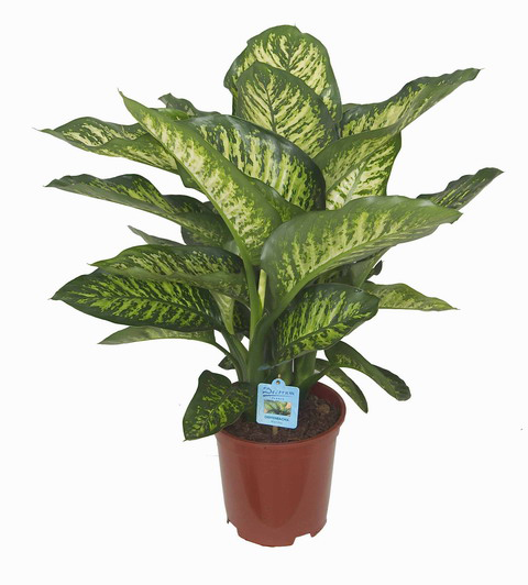- диффенбахия. Этот экземпляр относится к семейству Ароидных. Цветоводов привлекают красивые пятнистые разноцветные листья, окраска растения может отличаться.
