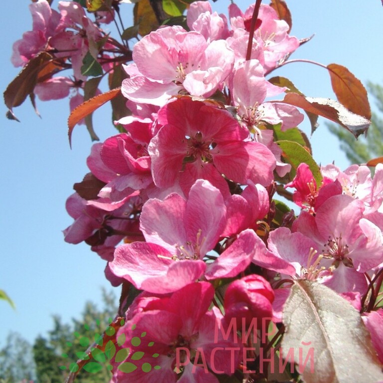 Высота дерева не выше 5 метров, крона хорошо сформированная и сильно раскидистая. Во взрослом состоянии она станет почти шарообразной. Хорошо откликается на обрезку и стремится сохранить форму, которую придал человек. Ветки имеют слегка фиолетовый оттенок. Цветет более 10 дней ароматными цветами насыщенного темно-красного, немного фиолетового цвета. Листва имеет темно-зеленую окраску. Плоды представляют из себя гроздья маленьких красных яблочек с кислым вкусом, они пригодны для приготовления компотов.