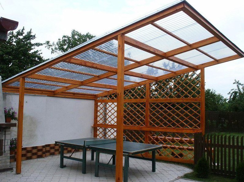 Если полного затенения не требуется, можно использовать поликарбонат. Он, кстати, самый популярный в последнее время материал. Только выбирать его необходимо правильно: брать многокамерный, имеющий как минимум, три слоя пластика и два ряда ячеек. Под таким навесом из поликарбоната даже в солнечный день нежарко.