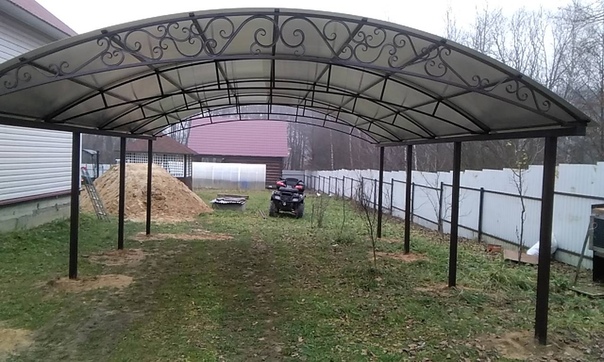 Если делают навес из поликарбоната, то крышу делают сводчатую. Она оптимальна и с точки зрения схода осадков и легко реализуется благодаря гибкости этого материала.