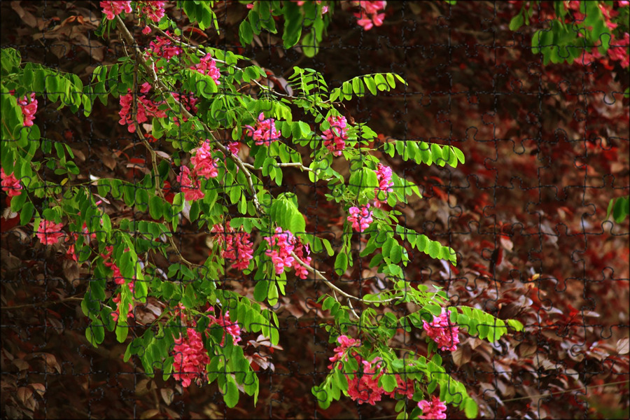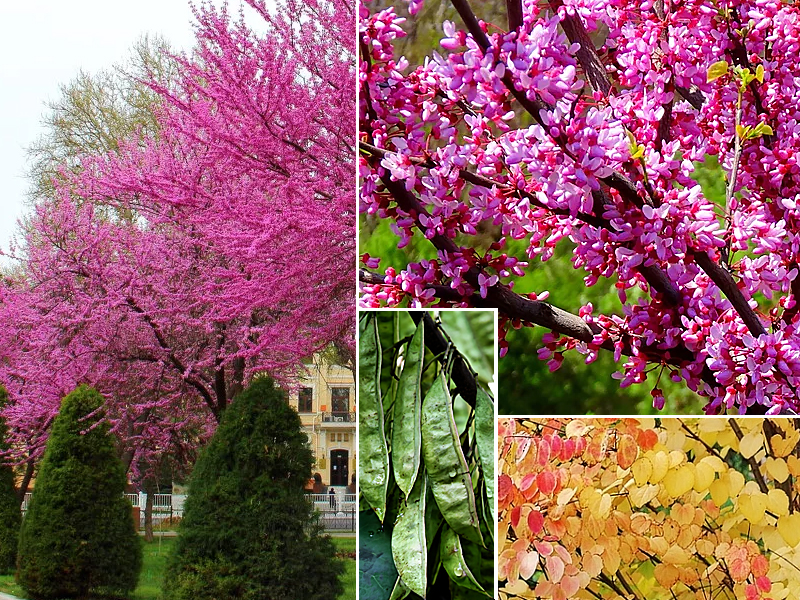 Небольшое многоствольное дерево с розовыми цветами и красновато-фиолетовыми листьями, появляющимися одновременно весной.