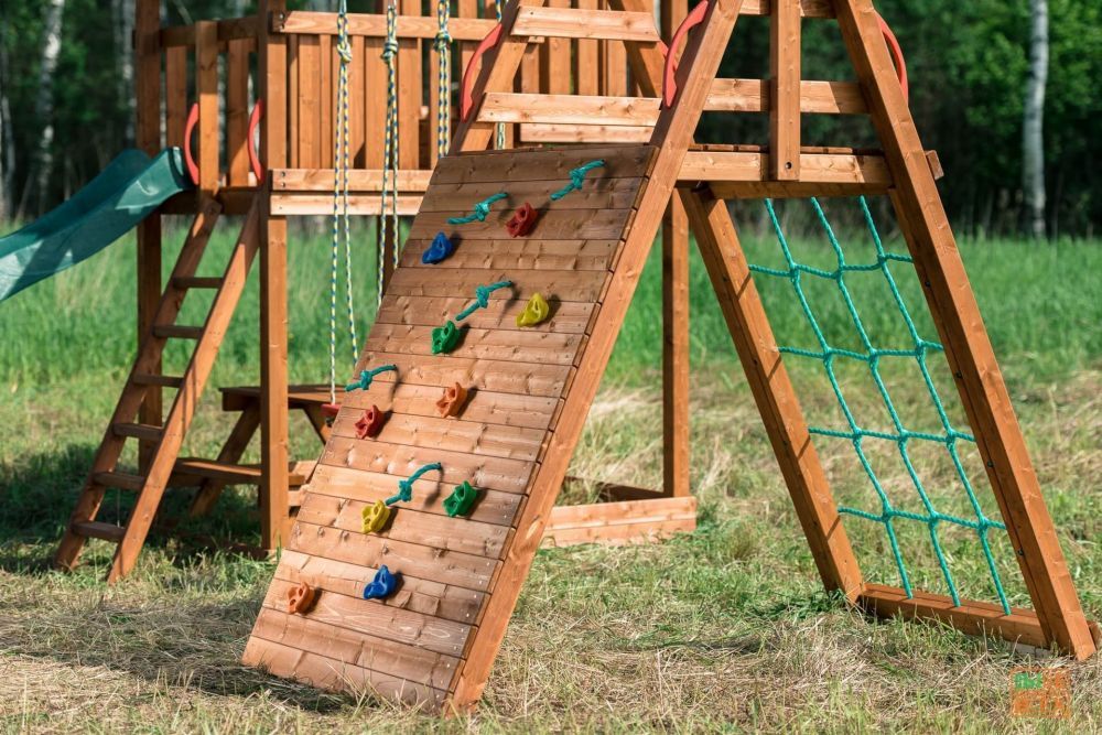 Данная идея легка в реализации. Можно просто к деревянной многоярусной конструкции пристроить специальную доску для скалолазания, еще повесить специальный прочный канат. А пол застелить гимнастическими матами, чтобы падения ребят были безболезненными и не сопровождались никакими травмами.