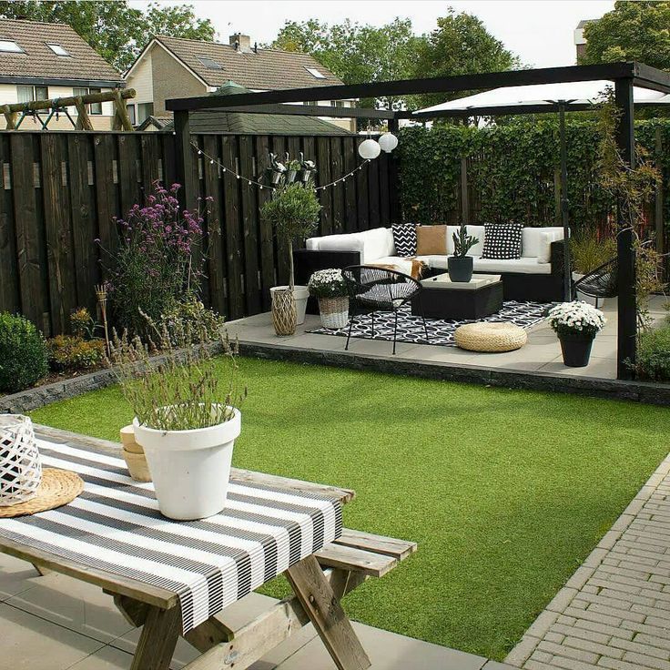 Обдумывая идеи ландшафтного дизайна для маленького двора, не забудьте оставить место. Легко перегрузить вещи и непреднамеренно создать эффект клаустрофобии. Здесь зона отдыха имеет четкий вид на сад благодаря небольшому участку травы и беспрепятственному ландшафтному дизайну.