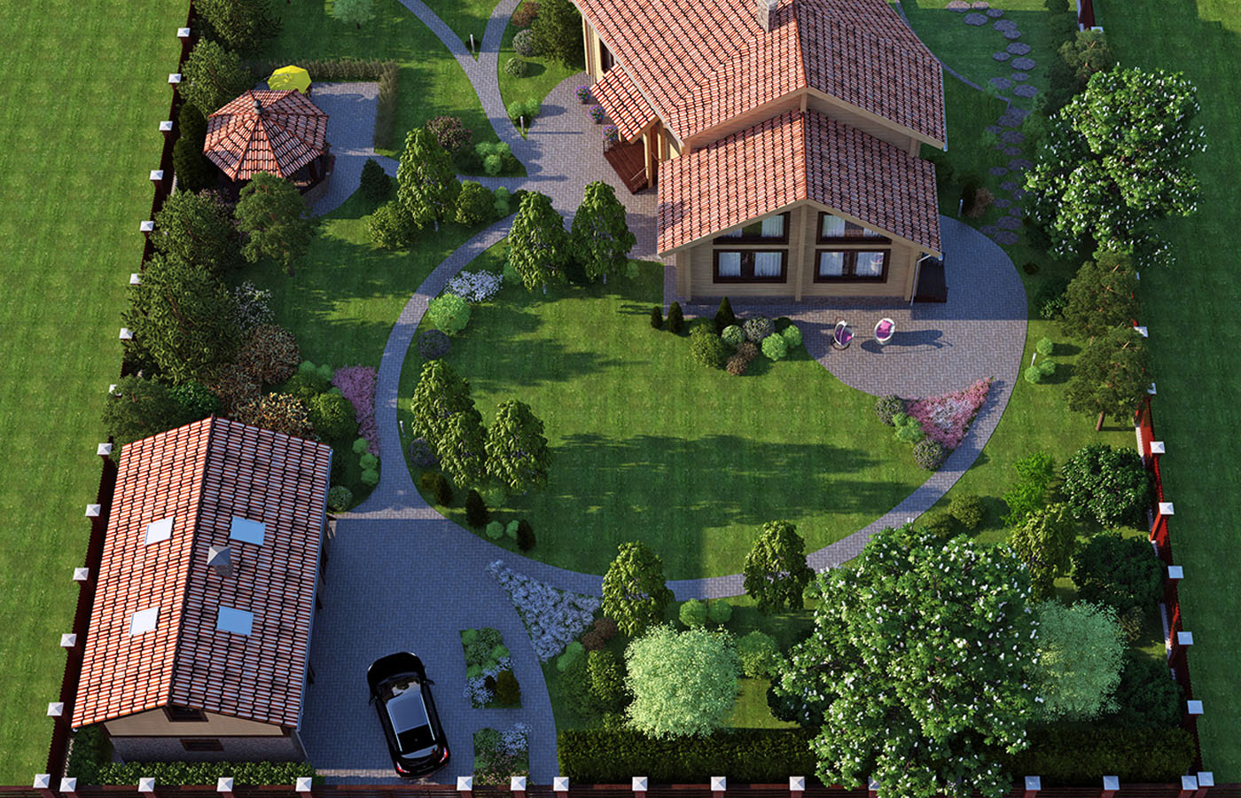 - Учитывают предпочтения и потребности всех членов семьи: может потребоваться устройство беседки, зоны барбекю, скамейки в тени сада для тихого отдыха за книгой, игровой площадки для детей, бассейна.