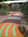 Для ландшафтных дорожек подходит как резиновая плитка, так и бесшовное покрытие. Используйте покрытие нескольких оттенков, чтобы зонировать приусадебную территорию или выложить красивые узоры.