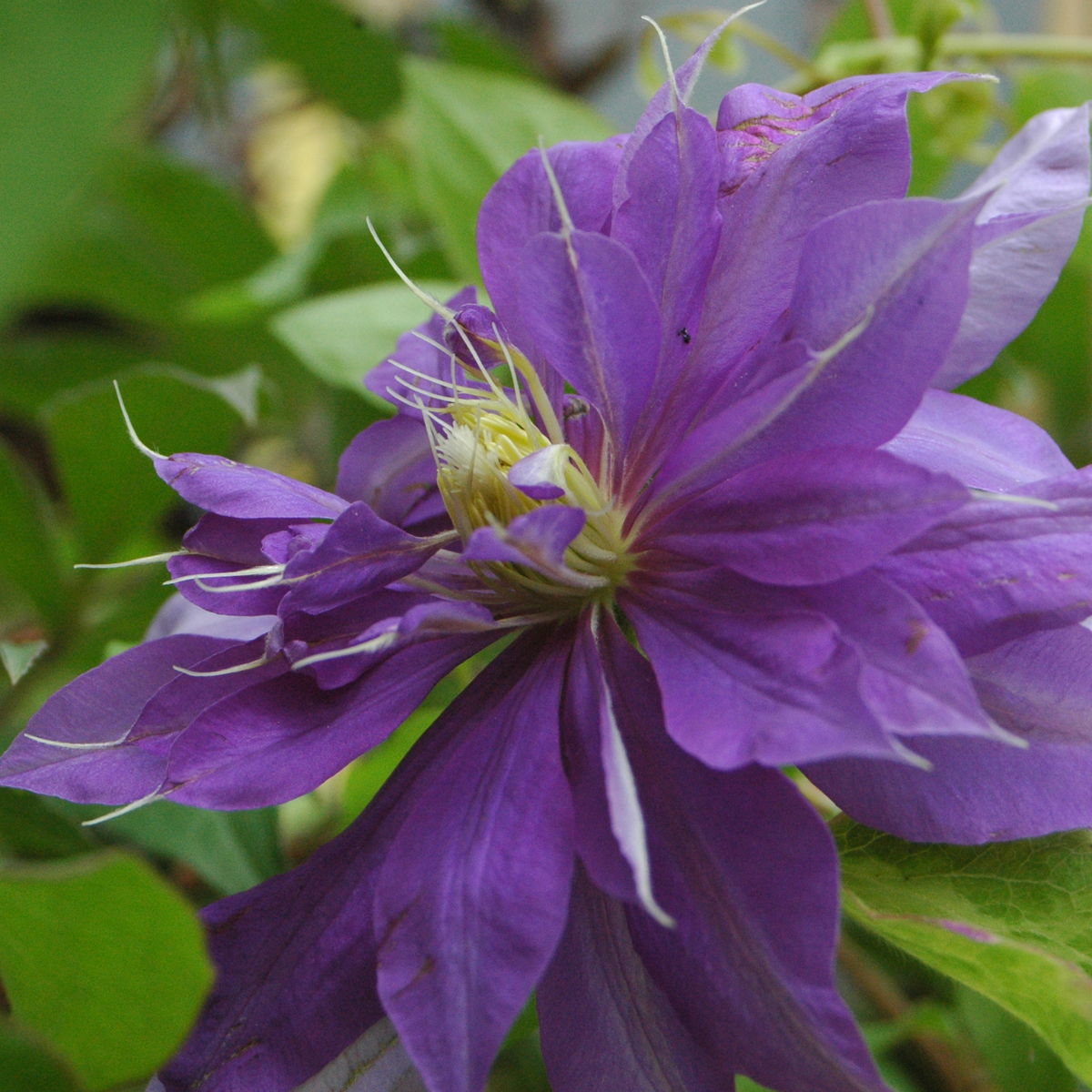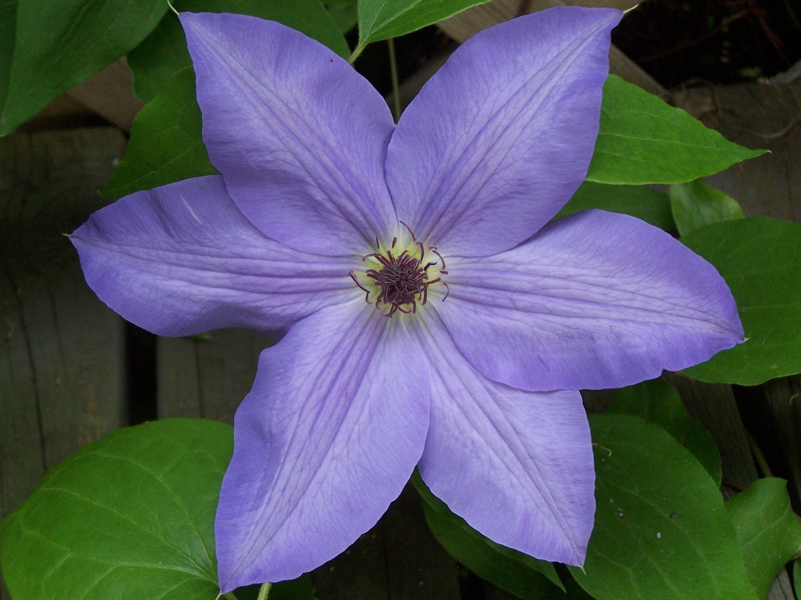 Джекмания. Высота куста до двух метров. Период цветения происходит с июня по сентябрь. Цветки наделены сине-фиолетовым темным окрасом и пыльниками кремово-зеленоватого оттенка и диаметра 15 сантиметров.