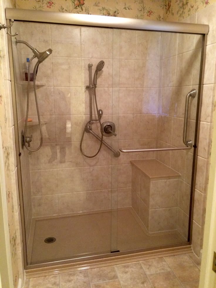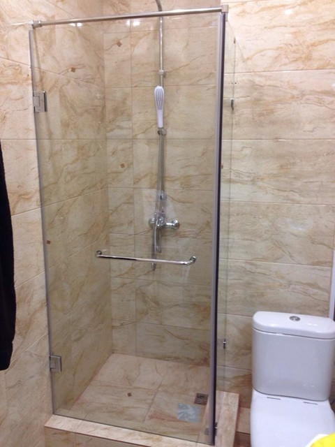 Если кабина прямоугольная, все решается более-менее просто: прямоугольник можно вырезать и из стекла в мастерской. Навесов для стеклянных дверей много, можно выбрать более удобный для вашего случая. Только заказывать двери идите с навесами: придется под них сверлить отверстия, и лучше всего их примерить.