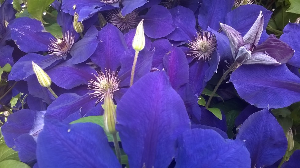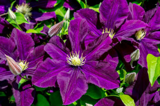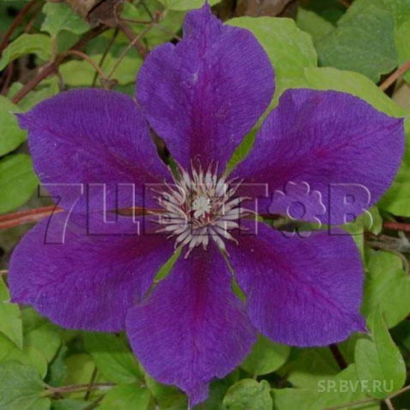 Бутоны формируются на 5-ти верхних узлах, образованных в текущем сезоне. Цветки достаточно крупные, диаметр варьируется в пределах 11-15 см, реже 18. Окрашены в пурпурно-фиолетовый колер, поперечная полоса ярко-выраженная. Не выгорают на ярком солнце. На одном побеге может располагаться до 20 соцветий.