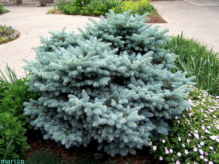 Низкорослые еловые растения хорошо смотрятся с кустарниками и цветами на клумбах