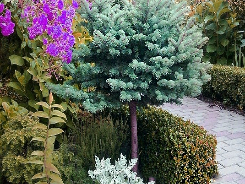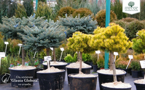 Я покупала молодое растение на тоненьком штамбе. Обычно прививают на штамб обыкновенной ели. Со времене штамб толстеет, но следует знать, что высота штамба останется неименной, поэтому при выборе растения сразу учитывайте это момент. Я вот немного не рассчитала и мой штамб немного низковат. Можно было выбрать и повыше.