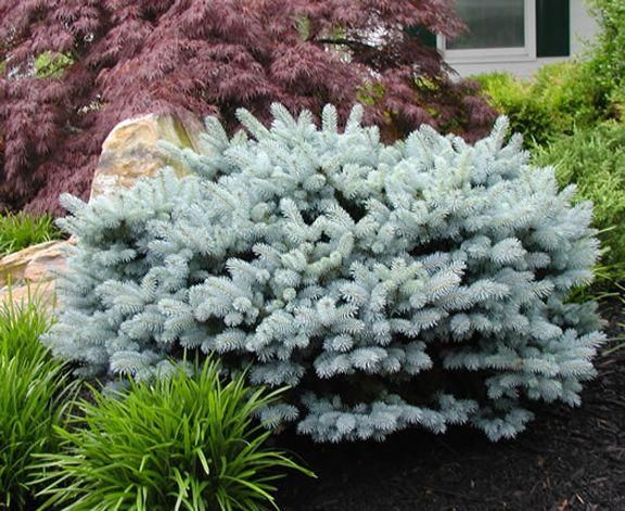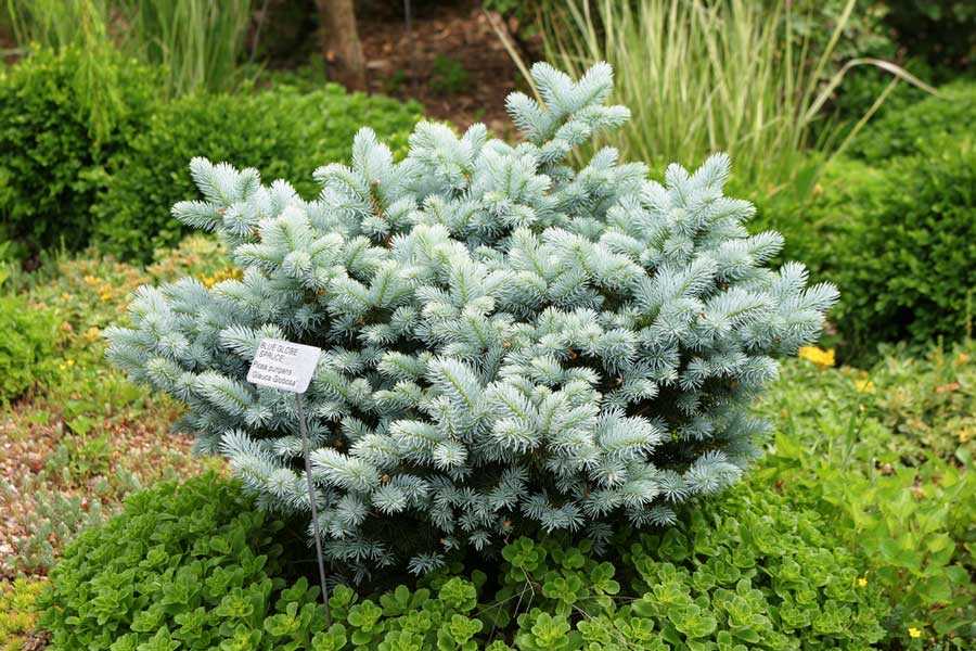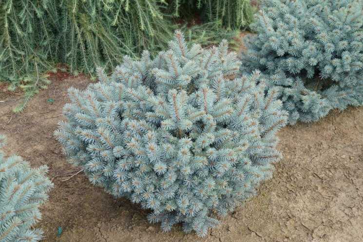 - ель колючая «Глаука Глобоза» (Picea pungens Glauca Globosa) — медленно растущий сорт, ежегодный прирост 5-8 см.