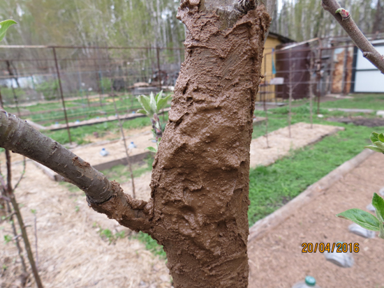 Нужно особенно внимательно замазывать открытые участки живой древесины глиной с навозом, дабы уменьшить губительное влияние солнечных лучей и отвадить вредящих насекомых от этих мест.