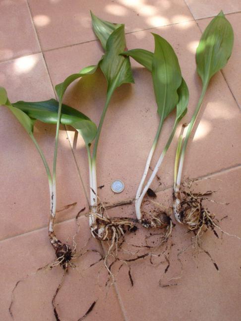 Смотрите, завод вышел. Вот и корневая система. В принципе, даже этот ком земли не сильно зарос корнями. Обычно здесь на поверхности все белое. Поэтому делить можно, но, честно говоря, мне даже жалко делиться. Делить — просто разорвать пополам, и каждый получившийся делитель, в котором несколько луковиц, просто переложить в отдельную емкость. Но мне даже жалко его трогать, потому что корней не так уж и много.Только внизу. А вот еще не заплетены корнями. Поэтому сейчас сделаю перевалку, тем более, что трансплантат и перевалка могут быть абсолютно одинаковыми.