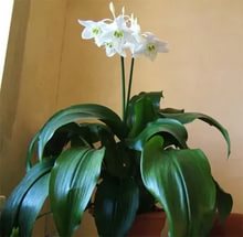 Eucharis в переводе с греческого означает «очень декоративный». Это луковичное растение с широкими темно-зелеными листьями и красивыми белыми цветами с прекрасным ароматом. Каждое растение дает до двух гроздей цветов.