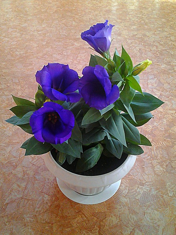 В комнатных условиях уход за цветком эустома ничем не отличается от ухода за растением в саду. Регулярный, но умеренный полив, своевременная подкормка два раза в месяц – вот практически и все необходимые мероприятия для цветка. Карликовая эустома в горшке хорошо ветвится, образует пышный куст, поэтому каким-то специальным образом формировать его не нужно.