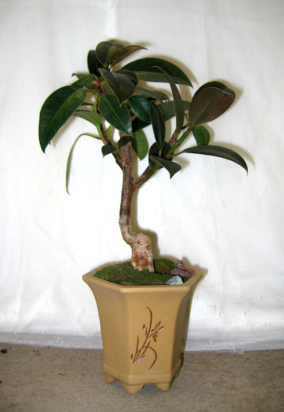 Баньян или бенгальский фикус является одним из эксклюзивных по декоративности, подходящих для выращивания бонсай. Листочки фикуса кожистые, по форме овальные, до 20 см. Выделяется из своих собратьев – фикусов формированием из корневой системы множества стволиков (до 100 штук). Стволики тонкие и образуют своеобразную крону.