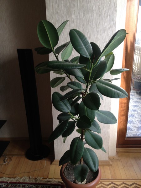 Каучуконосный эластика Робуста. Особенность: очищает воздух, листья мясистые с глянцевым блеском, высокорослый до 2 м. Способен образовывать воздушные корни при повышенной влажности воздуха.