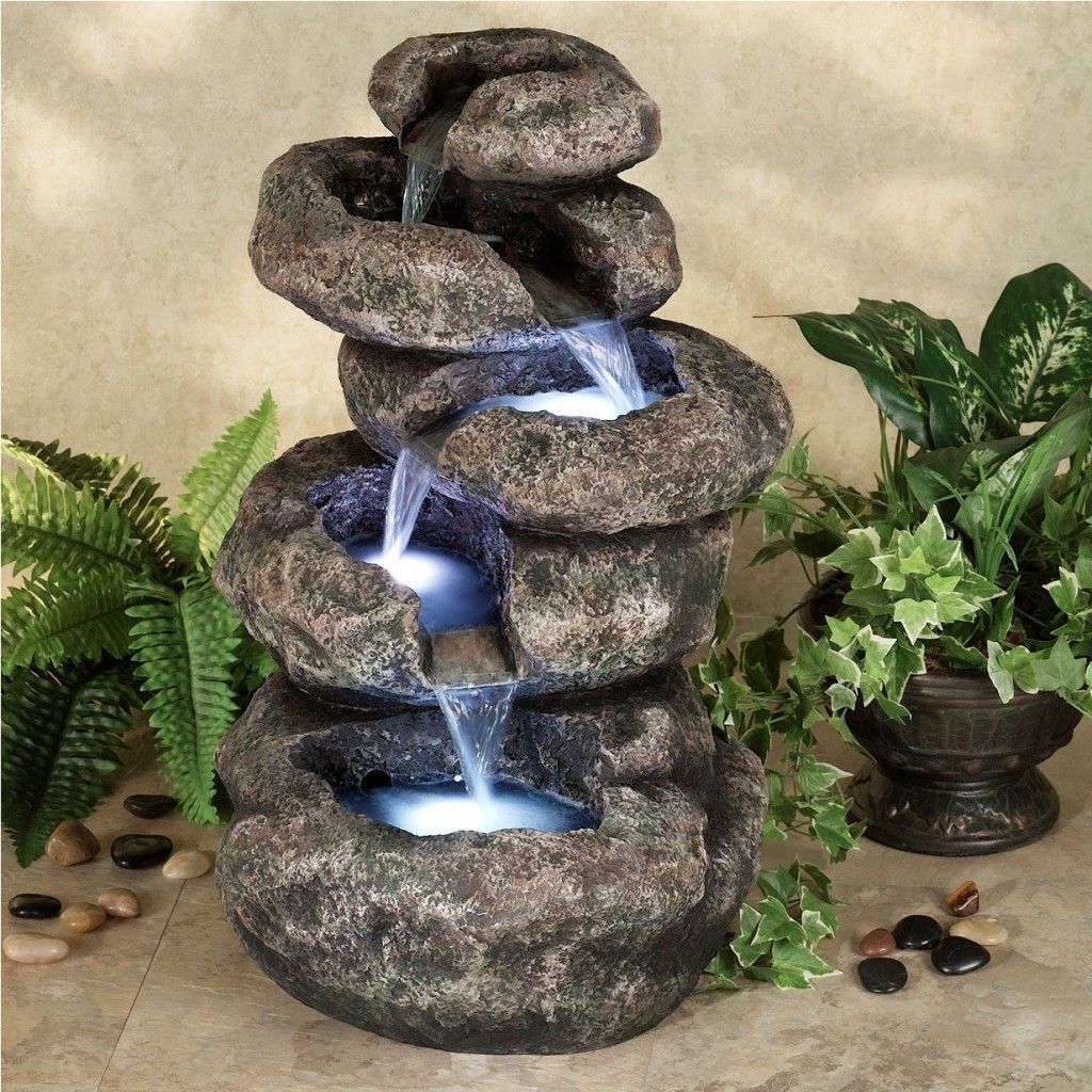 - Эффект сказочности придаст подсветка, которую помещают внутрь фонтана. Это могут быть стационарные фонарики, переливающиеся разными цветами.