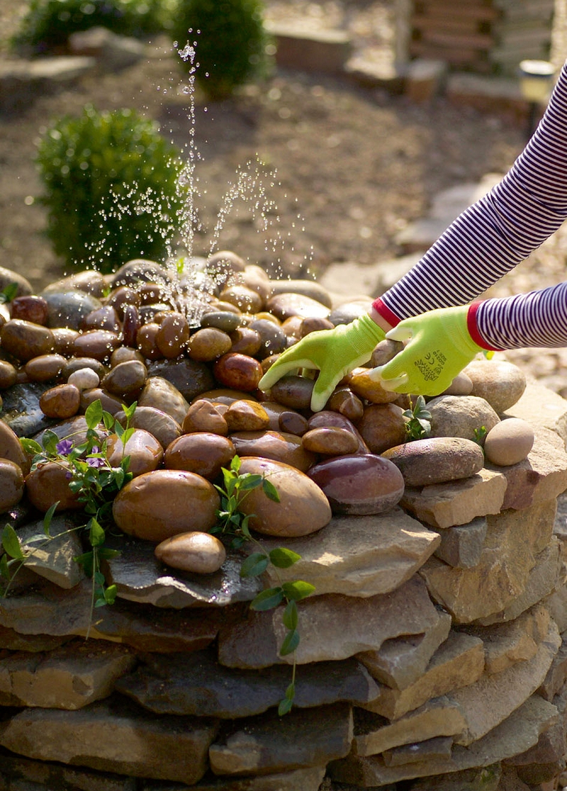 После того как все будет готово, можно приступать к монтажу верхней части и декору. Завершив обустройство верхней части, в фонтан наливают воду и подключают насос.