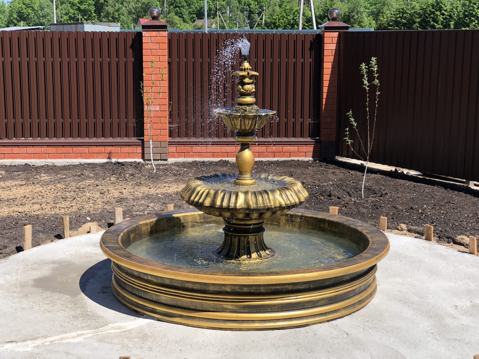 Для установки крупного фонтана с насосом необходимо вырыть котлован под фундамент, укрепить стены и сделать гидроизоляцию поверхностей, которые соприкасаются с водой.