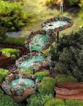При сооружении небольших фонтанчиков на даче в ход идут любые расходные материалы, включая шины от колес, плитку, изделия из керамики, каменные предметы. Такое сочетание позволяет соорудить стильные модные конструкции на любой вкус.